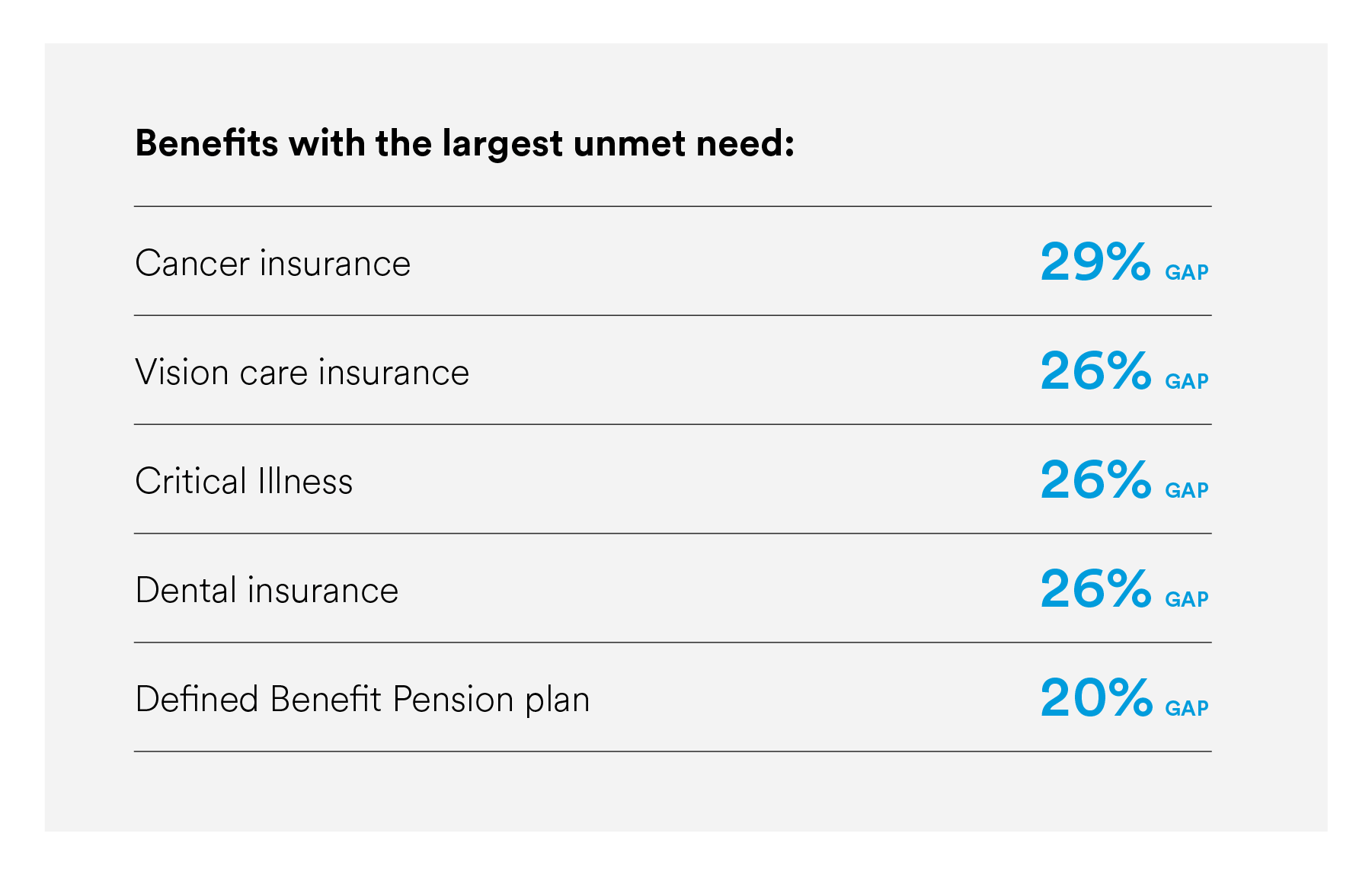 Yet, women crave a wider range of benefits than they’re currently receiving from employers. Just 49% of women say they’re satisfied with their wellness benefits and programs, compared to nearly two-thirds of men. In particular, women want their employers to offer innovative benefits including cancer insurance, vision care insurance, and critical illness insurance — and many find their employers falling short.