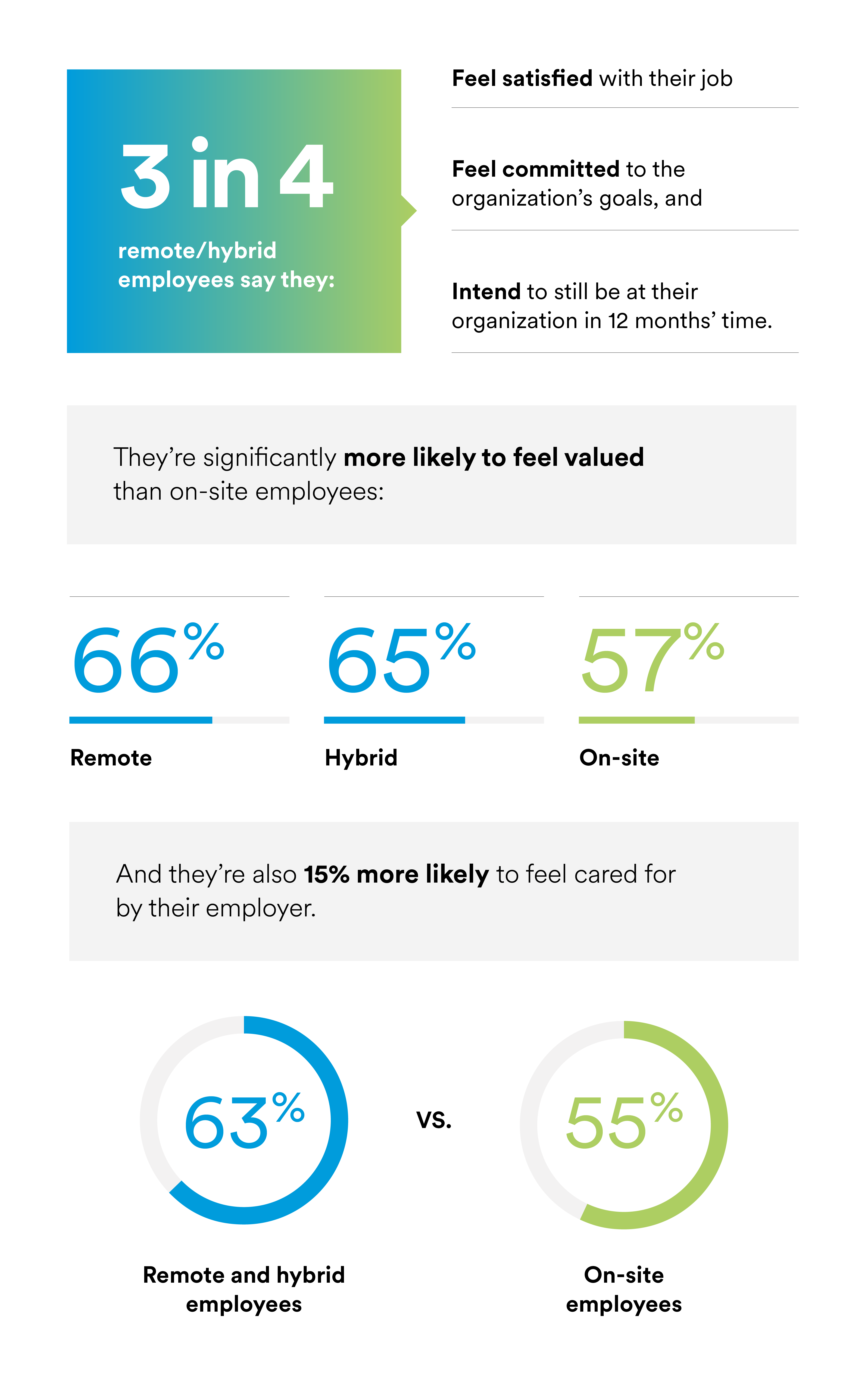 Three in four remote/hybrid employees feel satisfied with their job, committed to the organization’s goals, and intend to still be at their organization in 12 months’ time. They are more likely to feel valued, when compared to on-site employees and are 15% more likely to report feeling cared for by their employer.