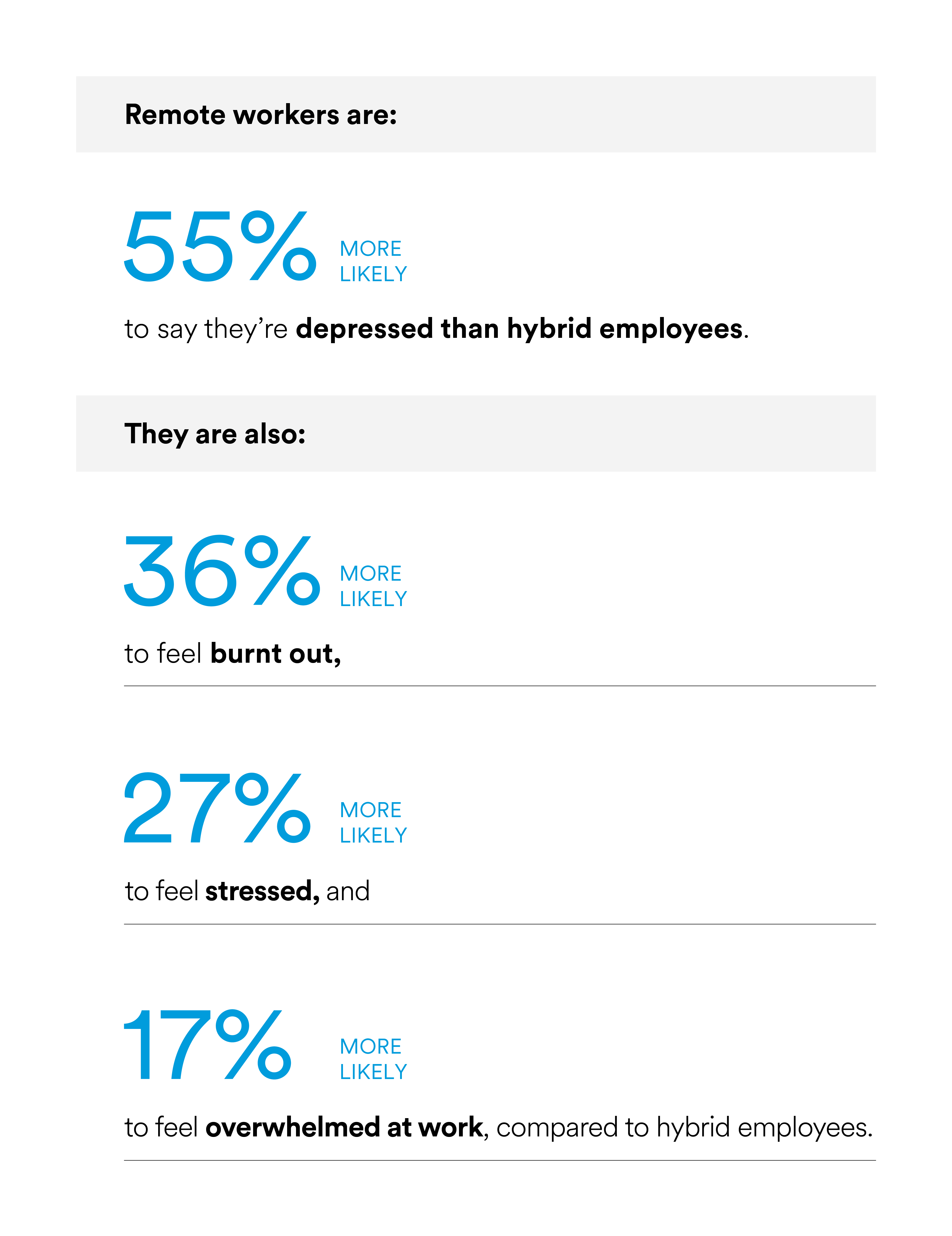Remote workers are 55% more likely than hybrid workers to say they’re depressed. They are also 36% more likely to report feeling burnt out, 27% more likely to feel stressed, and 17% more likely to feel overwhelmed at work, compared to hybrid employees.