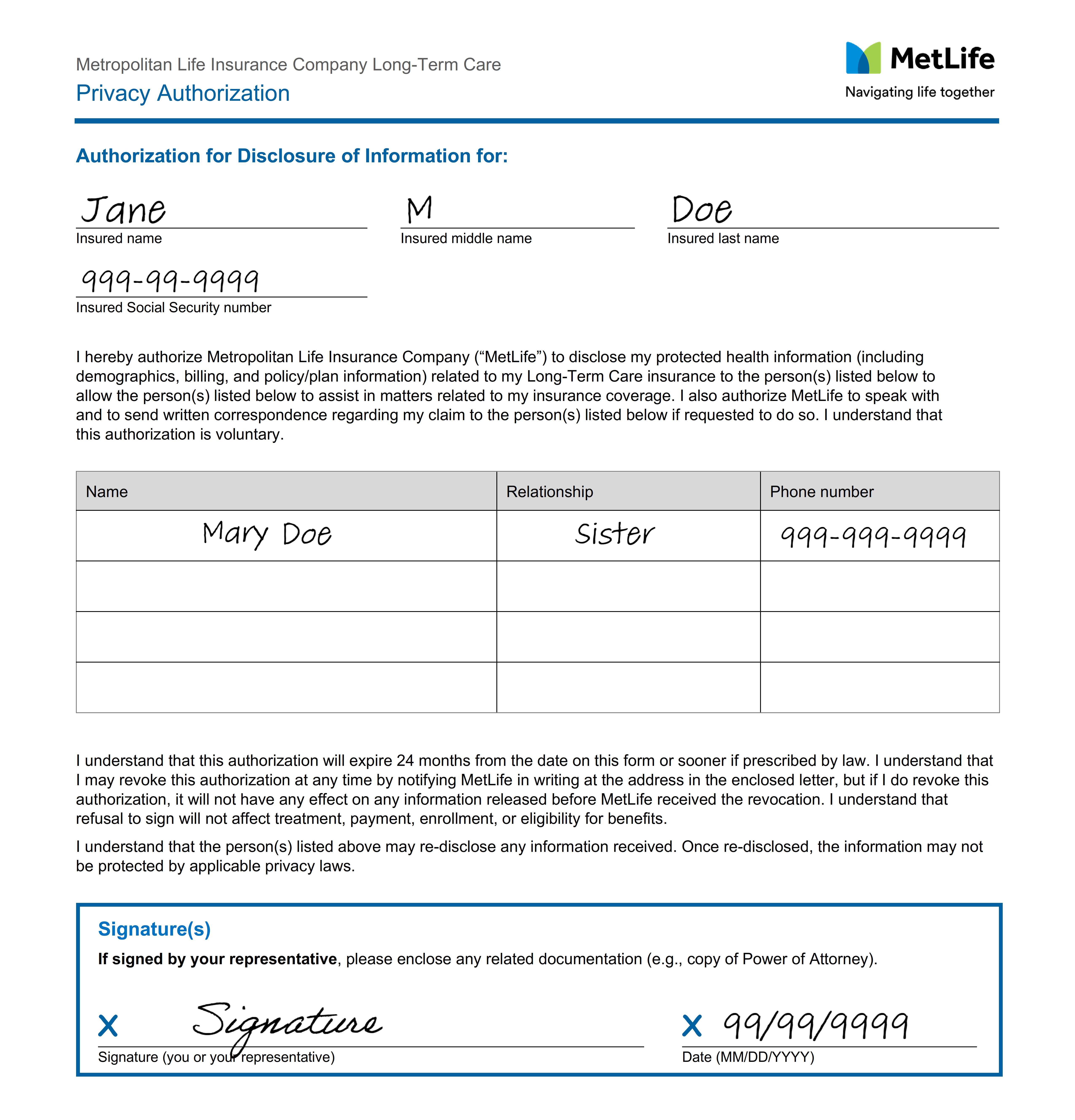 This form authorizes MetLife to release personal health information and policy details about your Long-Term Care claim to another person(s), such as family members or friends.