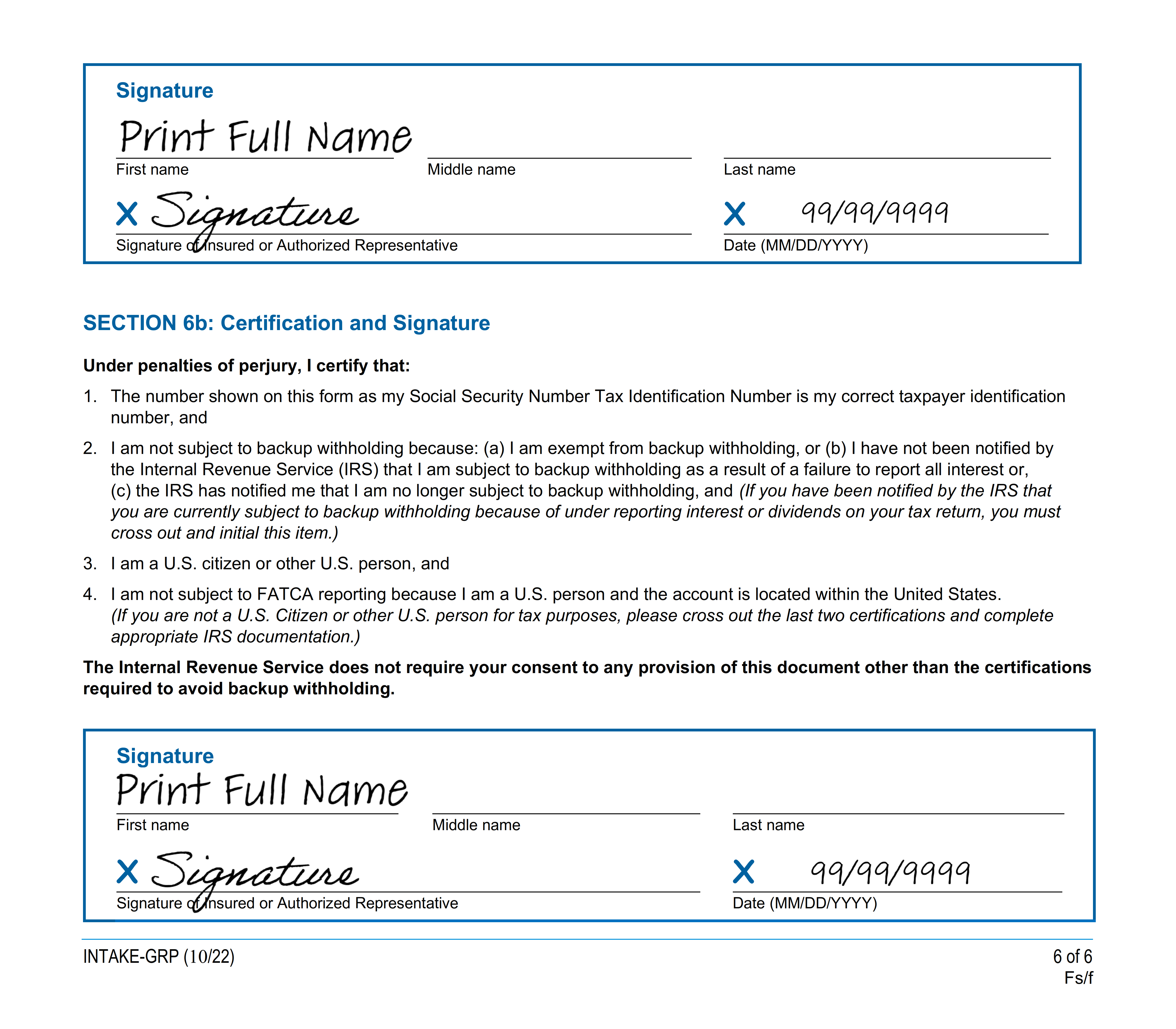 Both areas Section 6a/6b need to be completed by the Insured, Spouse, or the Legal Financial Representative.